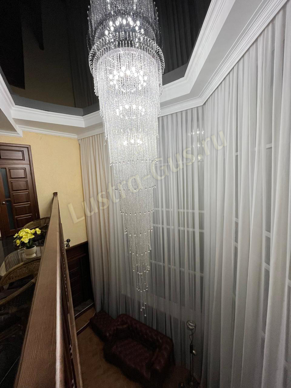 Для яркого освещения комнат с высоким потолком отлично подойдут длинные каскадные люстры. Для этого типа светильников характерна вытянутая форма. Из-за небольшого диаметра они не выглядят громоздко и эстетично дополняют дизайн помещения. По всей высоте расположено достаточное количество лампочек, чтобы осветить просторную комнату. Также длинную каскадную люстру можно повесить между маршами лестницы.