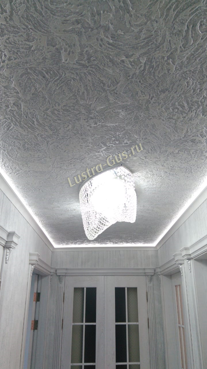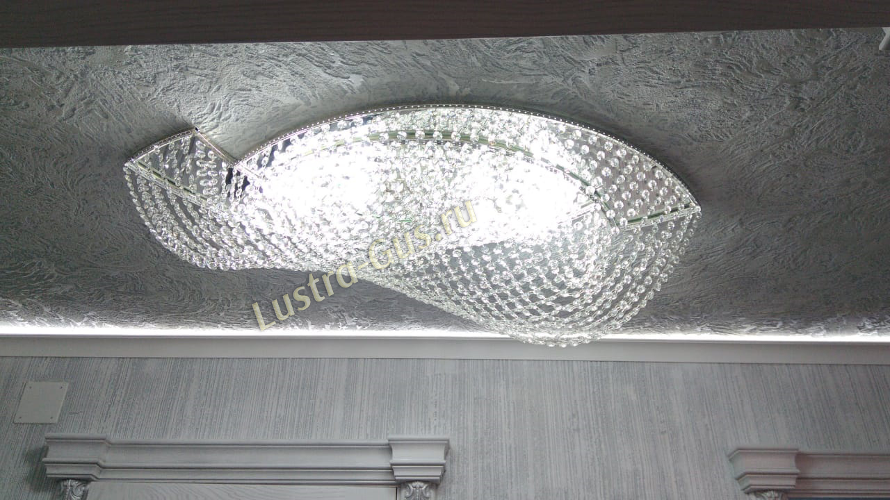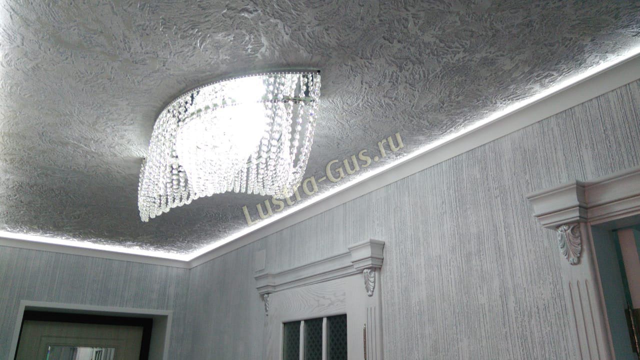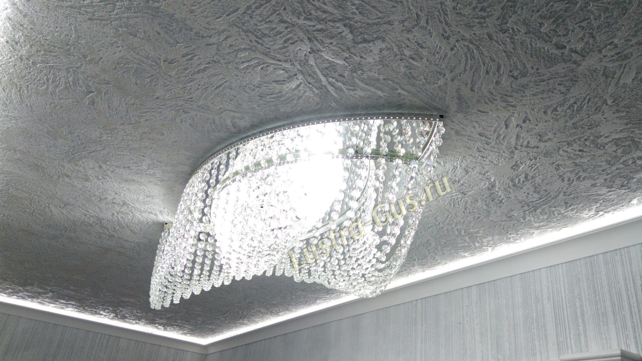 - Тип крепления - люстры подвешиваются на крюк, который предварительно крепится к потолку. Если после ремонта вы решили установить натяжной потолок, то рекомендуется использовать потолочные люстры. Для установки таких хрустальных светильников потребуется специальная монтажная планка.
